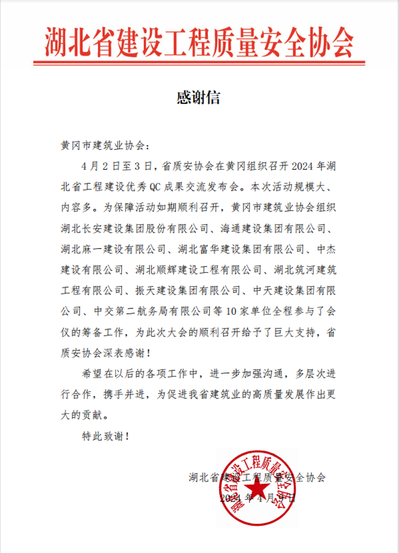 2024年湖北省工程建設(shè)優(yōu)秀QC成果交流發(fā)布會圓滿落幕--省建設(shè)工程質(zhì)量安全協(xié)會、黃岡市建筑業(yè)協(xié)會致集團(tuán)公司及個(gè)人的表揚(yáng)信