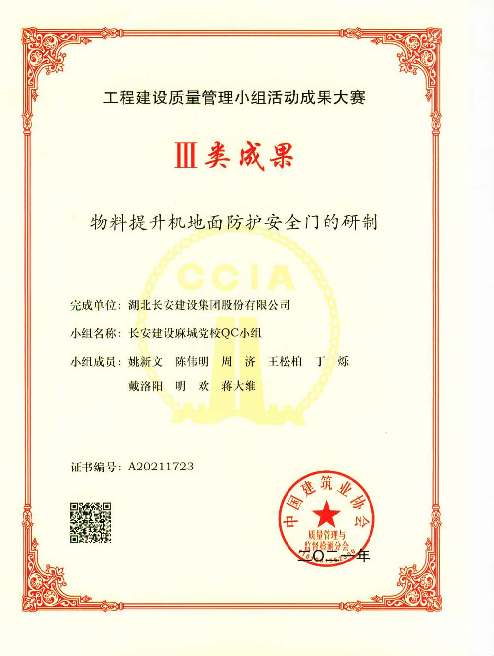 物料提升機(jī)地面防護(hù)安全門的研制榮獲工程建設(shè)質(zhì)量小組活動成果大賽Ⅲ類成果
