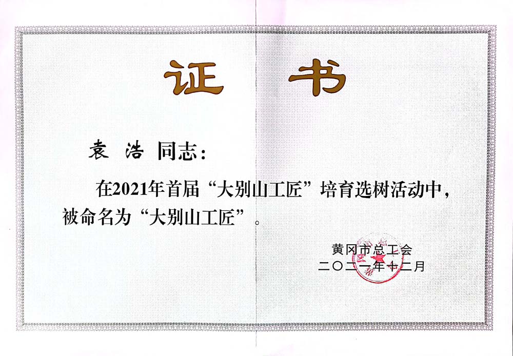 袁浩榮獲2021年首屆大別山工匠稱號