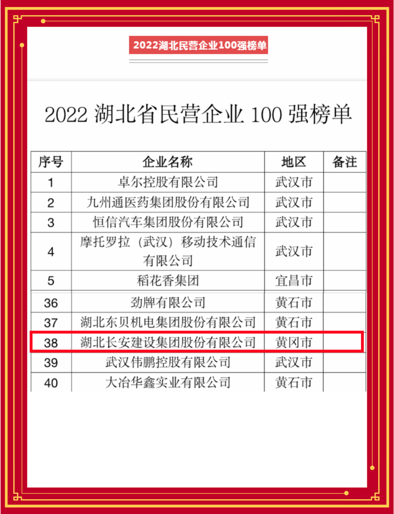 2022年湖北民營100強(qiáng),名列第38位