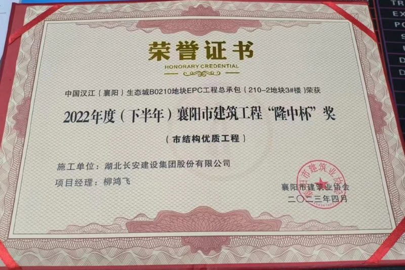 襄陽(yáng)生態(tài)城B0210地塊(210-2地塊3#樓)榮獲“隆中杯”獎(jiǎng)(市結(jié)構(gòu)優(yōu)質(zhì)工程)
