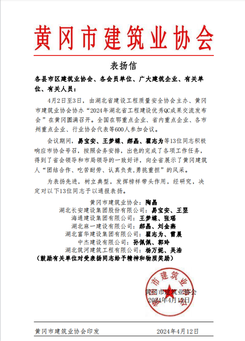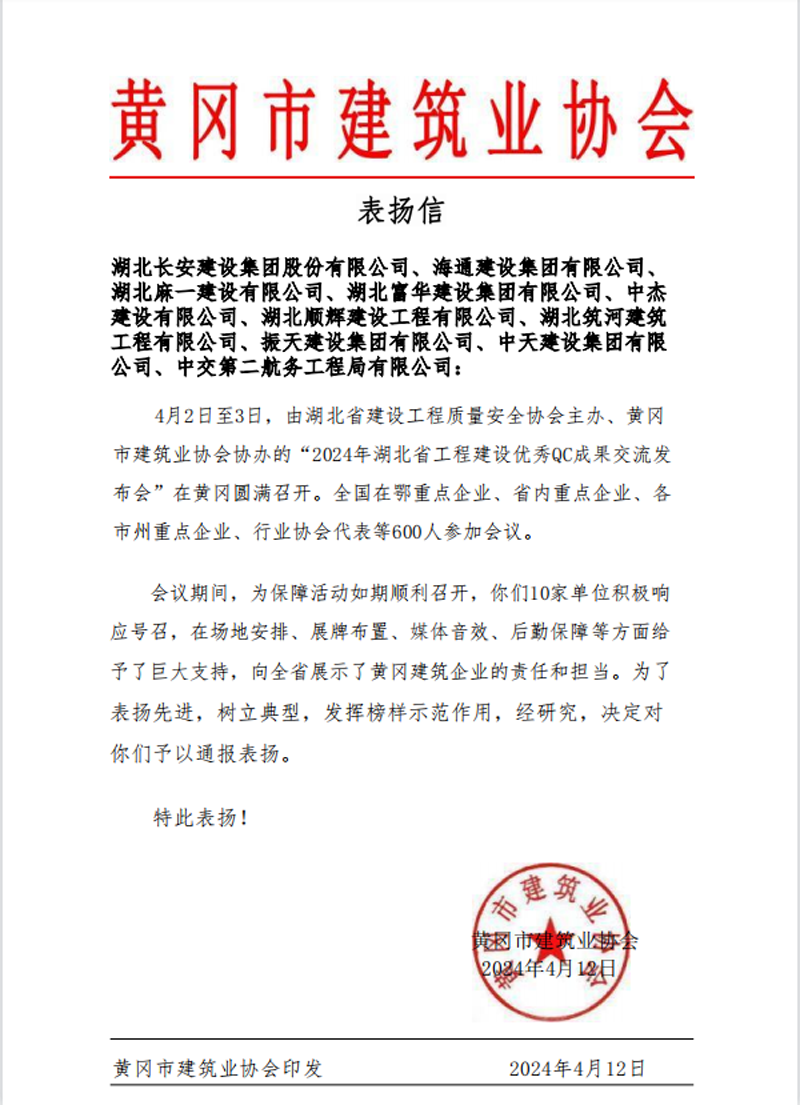 2024年湖北省工程建設(shè)優(yōu)秀QC成果交流發(fā)布會圓滿落幕--省建設(shè)工程質(zhì)量安全協(xié)會、黃岡市建筑業(yè)協(xié)會致集團(tuán)公司及個人的表揚(yáng)信