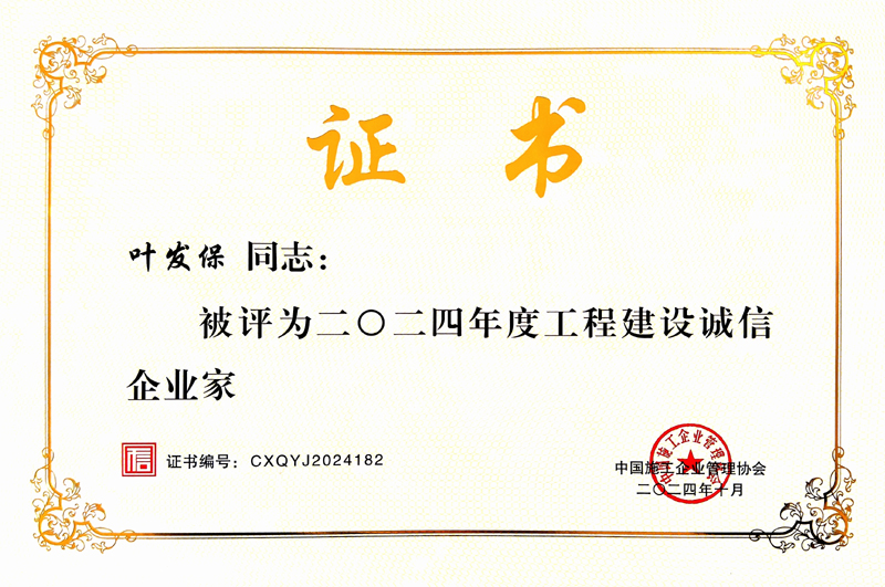 集團(tuán)總經(jīng)理葉發(fā)保獲評(píng)二○二四年度工程建設(shè)誠(chéng)信企業(yè)家榮譽(yù)稱號(hào)
