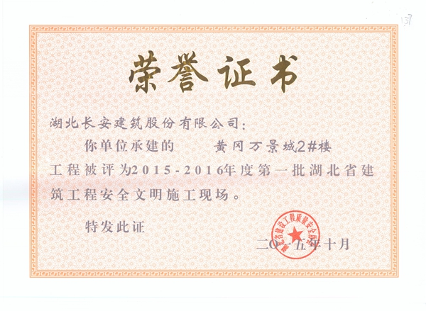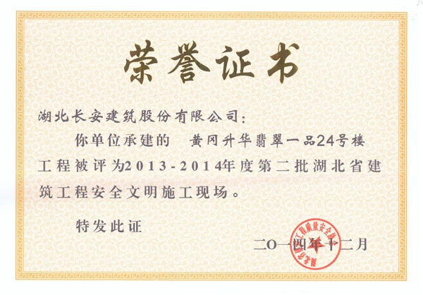 黃岡市教育優(yōu)秀人才安居小區(qū)1-3#樓被評(píng)為2013-2014年度省建筑工程安全文明施工現(xiàn)場(chǎng)