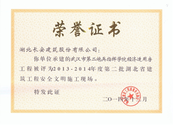 武漢市第二炮兵指揮學(xué)院經(jīng)濟(jì)適用房被評(píng)為2013-2014年度省建筑工程安全文明施工現(xiàn)場(chǎng)