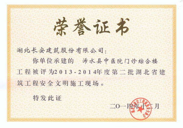 浠水中醫(yī)院門診綜合樓被評(píng)為2013-2014年度省建筑工程安全文明施工現(xiàn)場(chǎng)