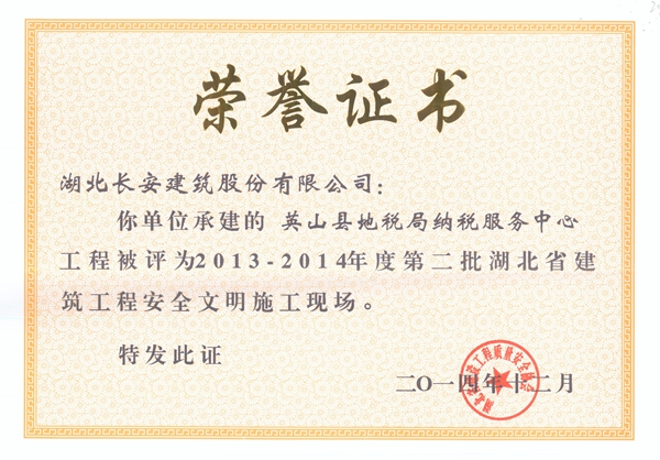 英山縣地稅局納稅服務(wù)中心被評(píng)為2013-2014年度省建筑工程安全文明施工現(xiàn)場(chǎng)