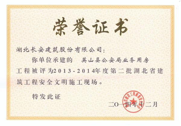 英山縣公安局業(yè)務(wù)用房被評(píng)為2013-2014年度省建筑工程安全文明施工現(xiàn)場(chǎng)