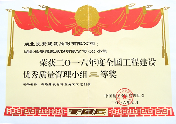 公司及QC小組榮獲2016年度全國工程建設(shè)優(yōu)秀質(zhì)量管理小組三等獎(jiǎng)(內(nèi)墻抹灰材料及施工工藝創(chuàng)新)