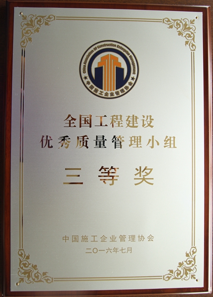 公司及QC小組榮獲2016年度全國工程建設(shè)優(yōu)秀質(zhì)量管理小組三等獎(jiǎng)(內(nèi)墻抹灰材料及施工工藝創(chuàng)新)獎(jiǎng)牌