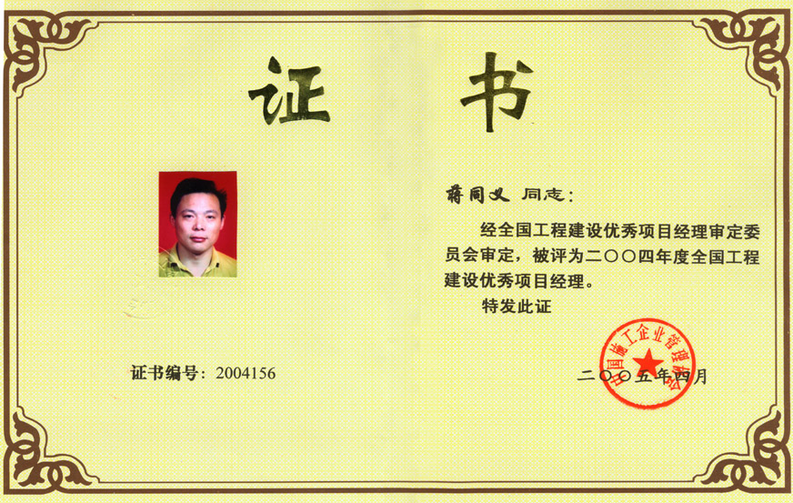 2004年度全國工程建設(shè)優(yōu)秀項(xiàng)目經(jīng)理(蔣同義)