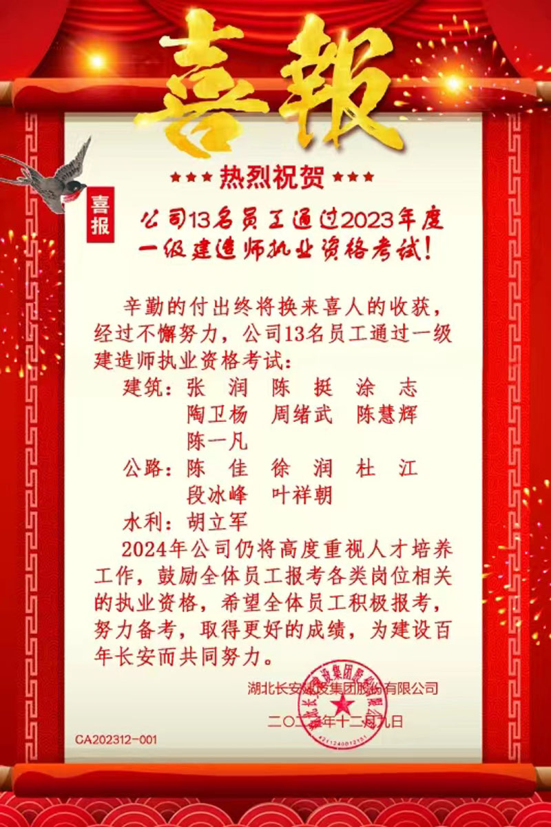 13名員工通過2023年度一級(jí)建造師執(zhí)業(yè)資格考試
