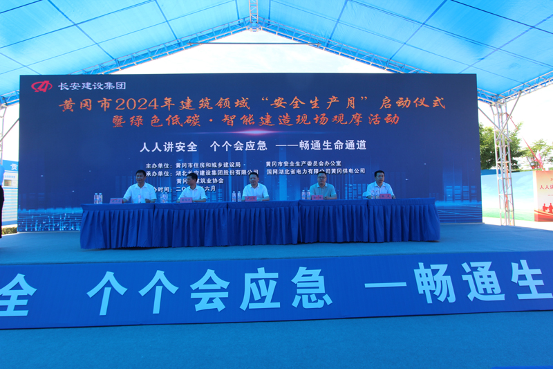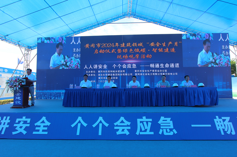 2024年6月是第23個全國安全生產(chǎn)月,主題為“人人講安全、個個會應(yīng)急—暢通生命通道”。為了進(jìn)一步強(qiáng)化安全意識,壓實(shí)安全責(zé)任,提高應(yīng)急處置能力,由黃岡市住房和城鄉(xiāng)建設(shè)局、黃岡市安全生產(chǎn)委員會辦公室主辦以及湖北長安建設(shè)集團(tuán)股份有限公司、國網(wǎng)湖北省電力有限公司黃岡供電公司、黃岡市建筑業(yè)協(xié)會協(xié)辦的黃岡市2024年建筑領(lǐng)域“安全生產(chǎn)月”啟動儀式暨綠色低碳?智能建造現(xiàn)場觀摩活動,于6月3日在國網(wǎng)湖北省電力有限公司黃岡供電公司生產(chǎn)綜合用房項(xiàng)目舉行。國網(wǎng)湖北省電力有限公司黃岡供電公司三級職員張成同志致歡迎辭,湖北長安建設(shè)集團(tuán)股份有限公司副董事長、總經(jīng)理葉發(fā)保作經(jīng)驗(yàn)交流發(fā)言。黃岡市住建局黨委書記、局長尹小軍以及黃岡市建筑業(yè)協(xié)會會長、湖北長安建設(shè)集團(tuán)董事長段衛(wèi)昌出席會議并講話,與主席臺領(lǐng)導(dǎo)嘉賓共同啟動觸摸球,標(biāo)志著以國網(wǎng)湖北黃岡供電公司生產(chǎn)綜合用房項(xiàng)目為引領(lǐng)的黃岡市2024年建筑領(lǐng)域“安全生產(chǎn)月”活動正式啟動,全面展開。