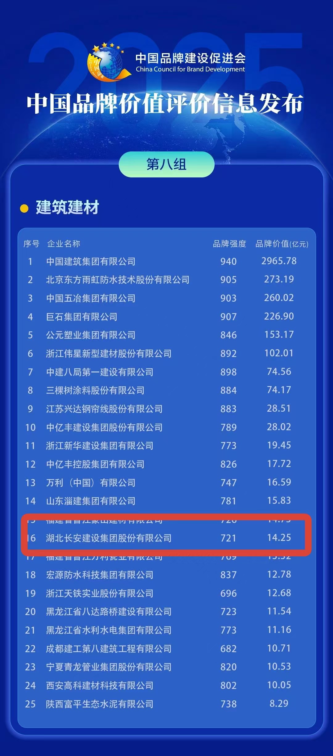 5月10日,在浙江省德清縣召開的2025世界品牌莫干山大會(huì)上,中國(guó)品牌建設(shè)促進(jìn)會(huì)、中國(guó)資產(chǎn)評(píng)估協(xié)會(huì)、新華社等單位聯(lián)合對(duì)“2025中國(guó)品牌價(jià)值評(píng)價(jià)信息”開展權(quán)威發(fā)布。英山縣本土企業(yè)品牌、“湖北長(zhǎng)安建設(shè)集團(tuán)股份有限公司”入圍建筑建材組榜單第16位,其品牌強(qiáng)度為721,品牌價(jià)值14.25億元,較上一年度增長(zhǎng)1.04億元,再創(chuàng)歷史新高。