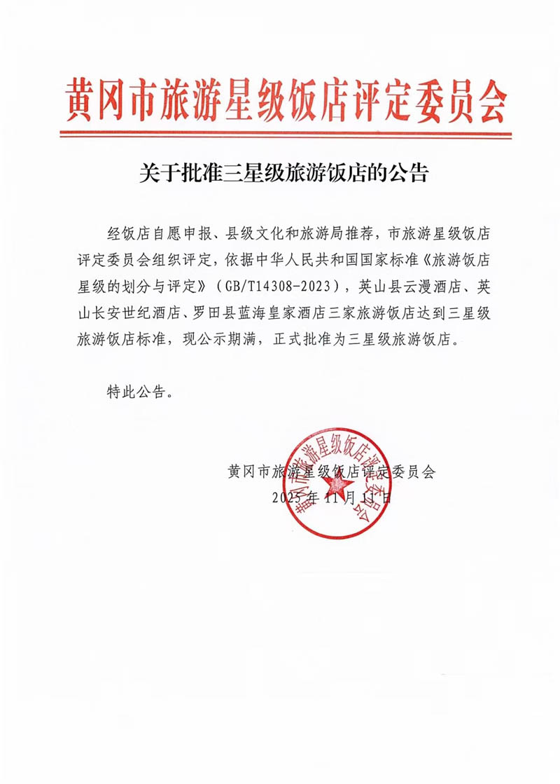 熱烈祝賀長(zhǎng)安世紀(jì)酒店獲評(píng)“三星級(jí)旅游酒店”