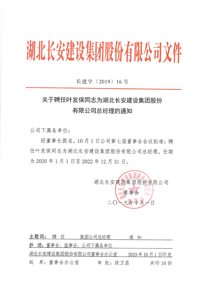 關(guān)于聘任葉發(fā)保同志為湖北長安建設(shè)集團股份有限公司總經(jīng)理的通知