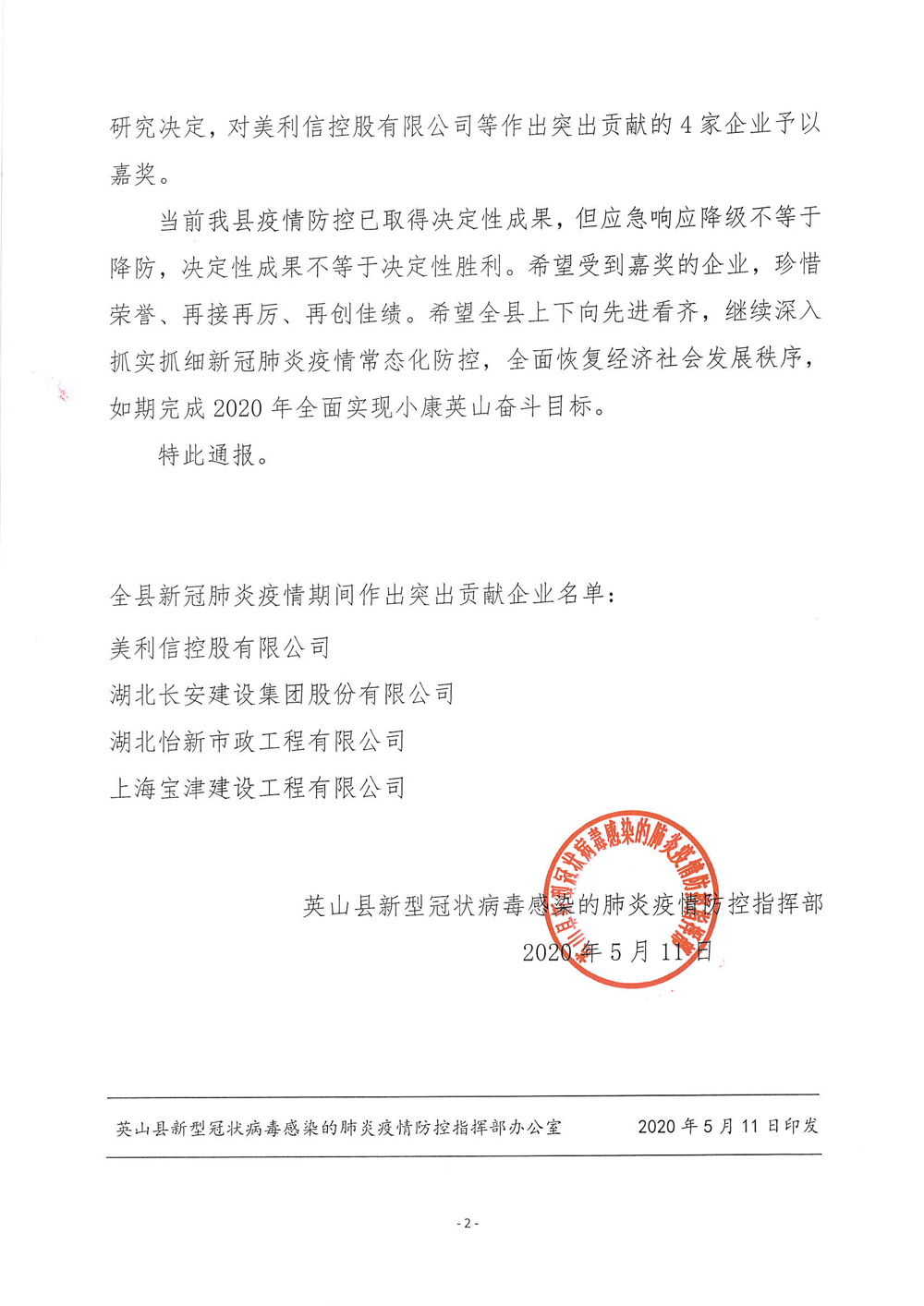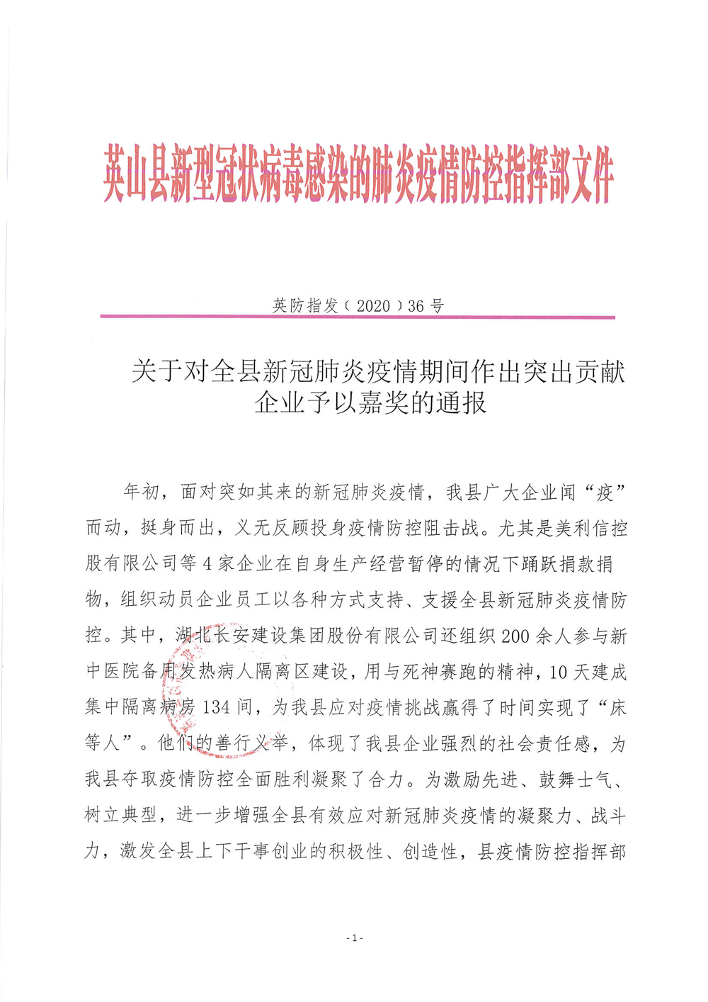 集團被英山縣新冠肺炎疫情防控指揮部評為“突出貢獻企業(yè)”