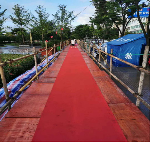 當(dāng)晚21:30,高一米、寬約兩米、總長約1000米、橋面鋪設(shè)溫馨紅地毯的“防洪橋”,宛如一條長龍,靜臥于夜色中。有效避免洪水倒灌,確保學(xué)生不涉水,為7月7日—8日高考生順利出入考場提供便利。此舉引起強(qiáng)烈反響,大量英山群眾、英山外出務(wù)工人員、學(xué)生家長紛紛點(diǎn)贊,長安建設(shè)集團(tuán)勇于擔(dān)當(dāng)?shù)拇髳坌袨閺V受好評。