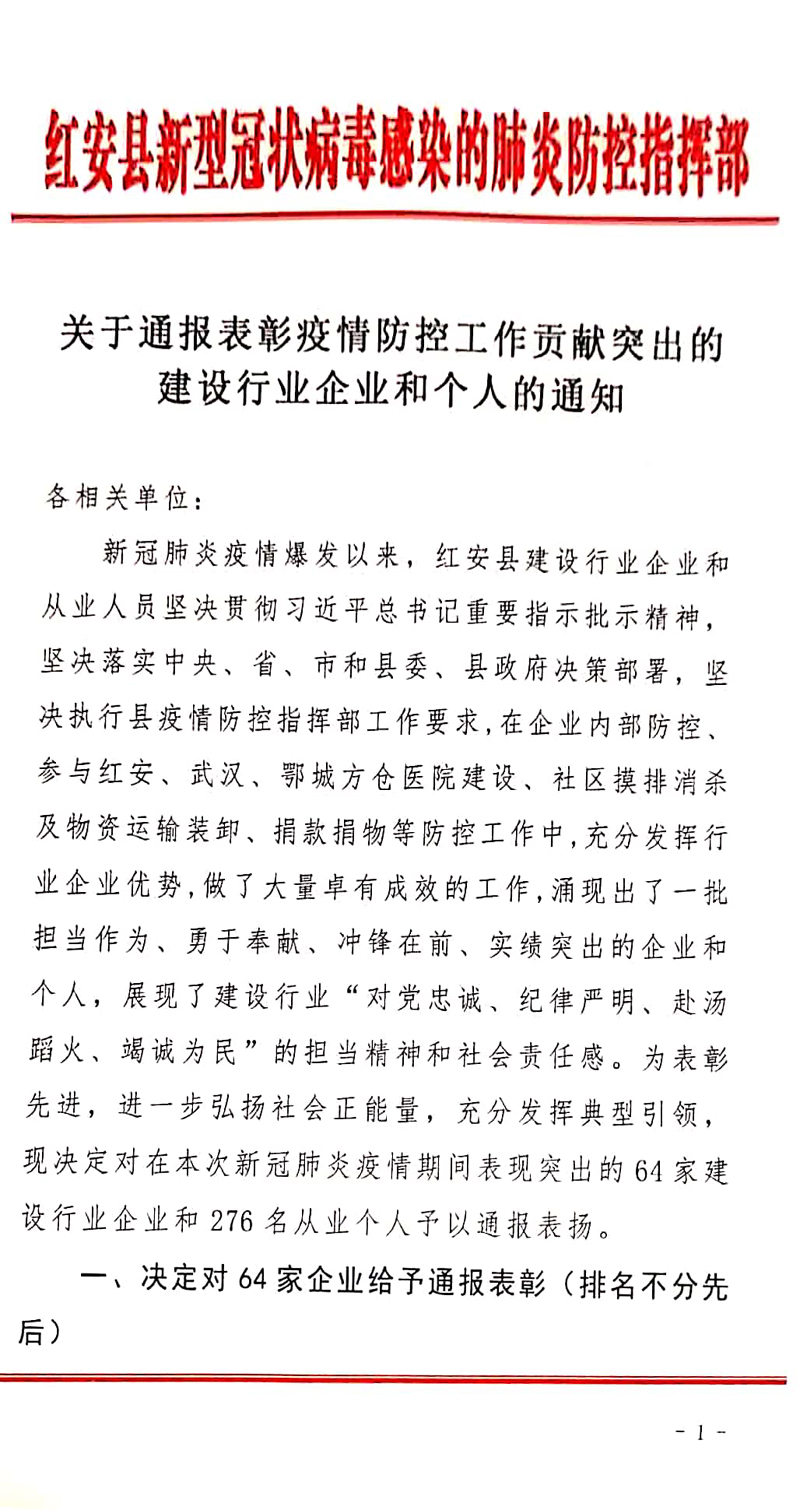 紅安縣疫情防控指揮部對(duì)集團(tuán)及個(gè)人予以表彰