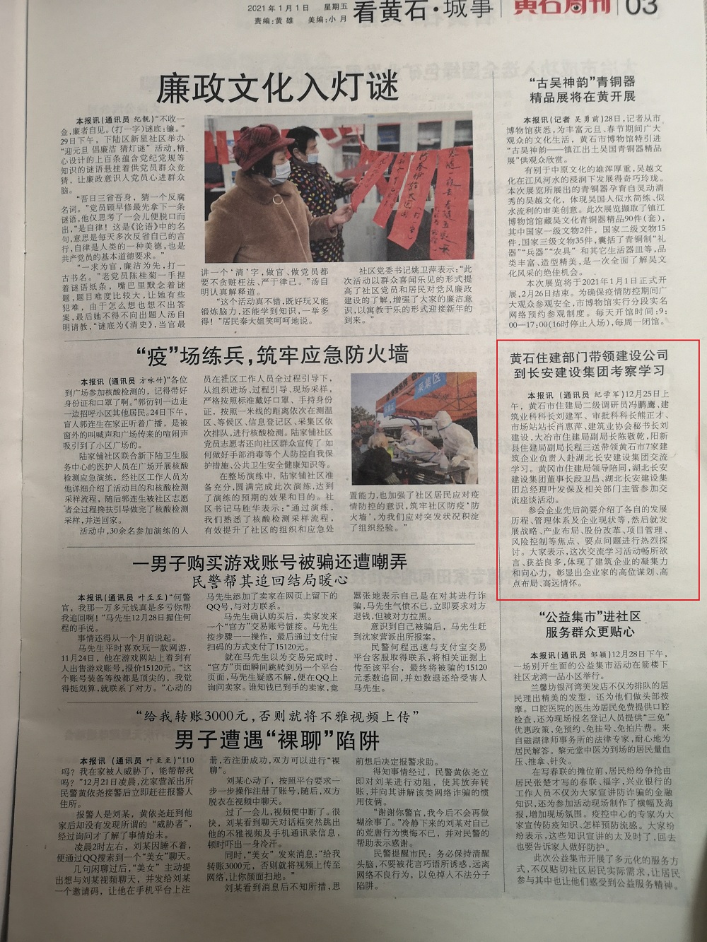 為加強住建系統(tǒng)的企業(yè)交流合作,共同促進建筑業(yè)高質(zhì)量發(fā)展,12月25日上午,黃石市住建局二級調(diào)研員馮鵬鷹、建筑業(yè)科科長劉建軍、審批科科長熊正才、市場站站長肖惠萍、建筑業(yè)協(xié)會秘書長劉建設,大冶市住建局副局長陳敬乾,陽新縣住建局副局長程三送帶領黃石市7家建筑企業(yè)負責人赴湖北長安建設集團交流學習。黃岡市住建局總工劉俊、建筑業(yè)科科長徐宏、英山縣住建局局長黃威陪同。湖北長安建設集團董事長段衛(wèi)昌、總經(jīng)理葉發(fā)保及相關部門主管參加交流座談活動。