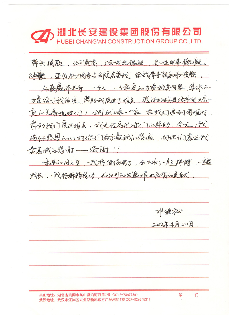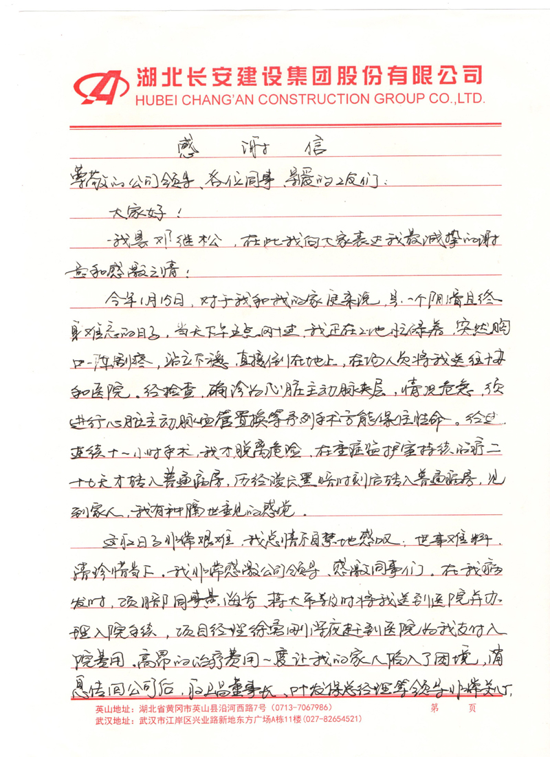 1月8日,集團(tuán)公司黨委開展2021年度困難職工幫扶活動,經(jīng)過深入調(diào)查摸底和專題會議研究,向沈楨等11位困難職工給予每人4000-5000元的困難生活補(bǔ)助;1月26日,當(dāng)獲悉鄧?yán)^松遭受病痛折磨,正在武漢住院治療的消息。集團(tuán)公司工會主動安排專人上門看望慰問,并向全體員工發(fā)出捐款獻(xiàn)愛心的倡議。在不到1天的時間里,共收到愛心款107840元。讓職工切切實實感受到長安大家庭的溫暖,體現(xiàn)了組織和領(lǐng)導(dǎo)對職工深厚而真摯的人文關(guān)懷,增強(qiáng)了員工的凝聚力和向心力。(附:鄧?yán)^松《感謝信》)